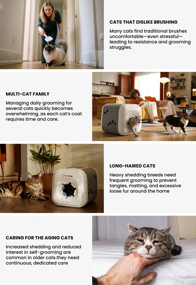 빗질을 싫어하는 고양이, 다묘 가정, 장모종 고양이, 지속적인 관리가 필요한 노령 고양이 등 일반적인 털 관리의 어려움을 겪는 모든 반려묘가 파우스윙 네오(PawSwing Neo)를 매일 스스로 이용하여 털을 관리할 수 있게 만듭니다.