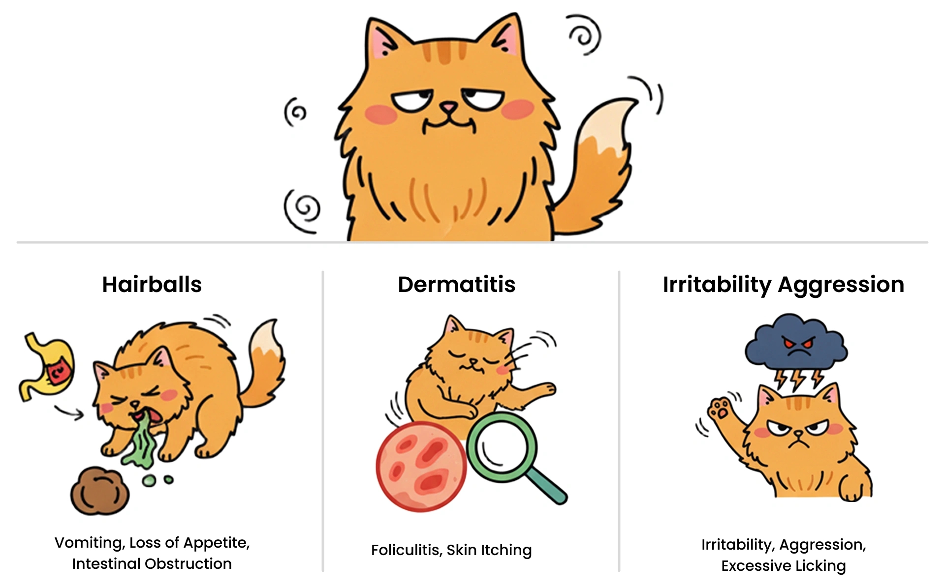 털 빠짐은 사람에게 뿐 아니라 고양이 자신에게도 심각한 부담을 줍니다. 과도하게 털을 삼키면서 헤어볼로 인한 구토, 식욕 부진 등을 겪을 수 있으며, 털 뭉침 및 축적으로 인해 피부염이나 과도한 그루밍 및 공격성 등의 심리적 문제를 유발할 수 있습니다.