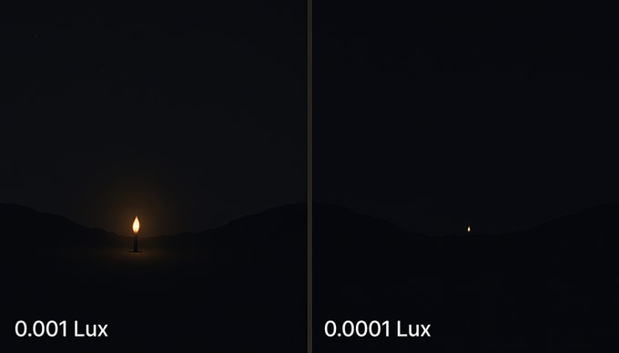 아래는 저조도 성능 수치를 시각적으로 이해할 수 있도록 만든 자료 입니다. 나이트스톰 X3는 육안으로 식별 불가능한 0.0001 lux의 극한 저조도에서도 모든 세부 요소를 정밀하게 포착해내는 압도적인 광학 성능을 의미합니다.