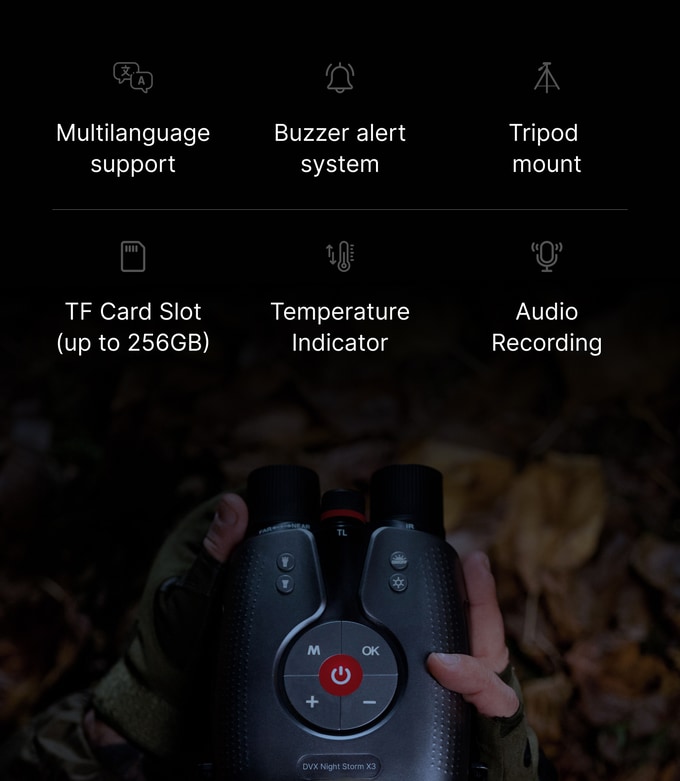 또한, 실시간 주변 온도를 화면에 표시하여 기온변화에 민감한 야생동물 추적시 유용한 보조 데이터를 제공합니다. 나이트스톰 X3는 군사급 성능과 실용성을 결합하여 극한의 실전 상황에서도 전문가가 믿고 사용할 수 있는 최상의 야간 광학 장비 입니다.