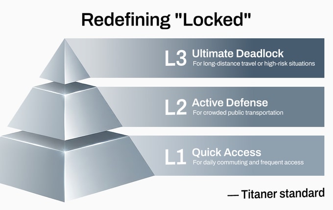 제조사인 타이타너(Titaner)는 20년간 티타늄을 다뤄온 전문성을 바탕으로 개발된 트라이던트(Trident)는 단순한 잠금 기능을 넘어 상황별 보안 수준을 향상시켰습니다. 평온한 일상부터 위험한 상황까지 모든 상황을 하나의 구조로 해결할 수 없다는 완벽주의적 관점에서, 마케팅 용어가 아닌 공학적 논리에 기반한 명확한 기계적 보안 표준을 수립했습니다.