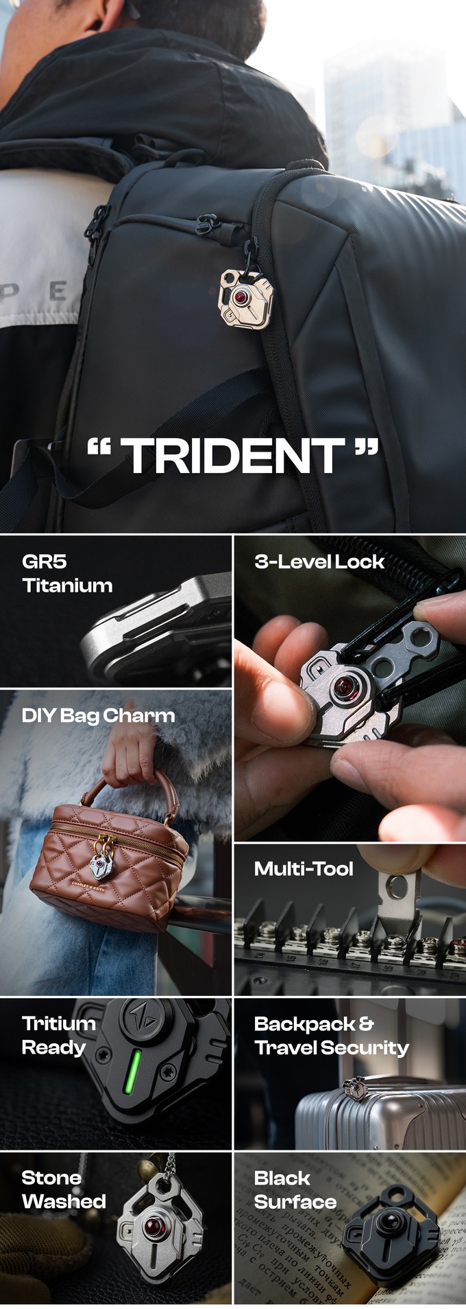 트라이던트(Trident)는 3단계 티타늄 지퍼 잠금 클립으로, 일상과 여행의 품격을 높이는 보안 장치 입니다. 항공우주 등급 GR5 티타늄으로 강하며, 정교한 기계식 잠금 장치와 멀티툴 기능을 결합해 단순한 자물쇠 이상의 가치를 제공합니다. 도난 방지는 물론 소음 차단과 스타일까지 완성하는 클립으로 사용자의 백팩이나 가방의 안전을 위한 가장 신뢰할 수 있는 기계식 보안장치 입니다.