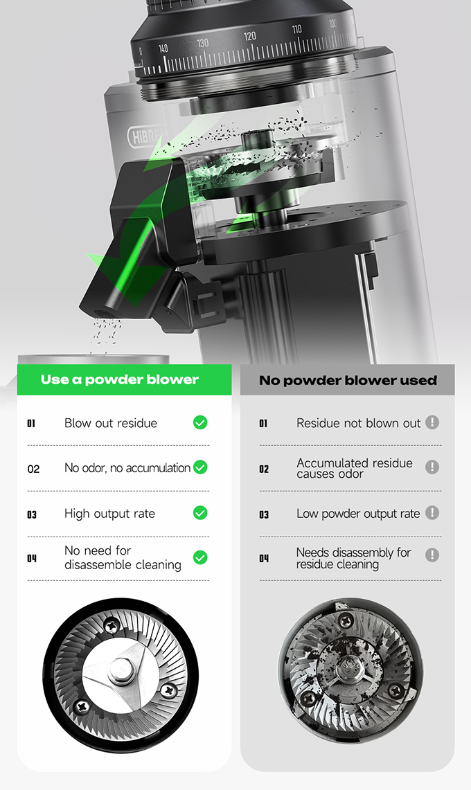 G64 시리즈의 에어 블로워를 사용하면 내부 잔류물을 효과적으로 배출하여 원두 간의 냄새 섞임과 가루 퇴적을 근본적으로 방지합니다.