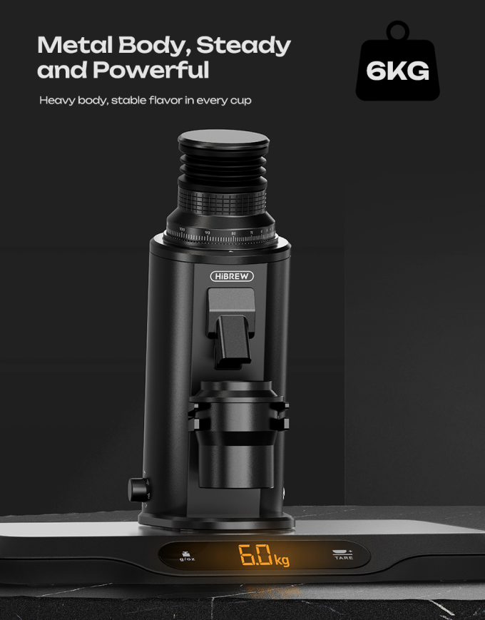 약 6kg의 묵직한 풀 알루미늄 메탈 바디를 적용하여 분쇄 시 발생하는 진동을 효과적으로 억제하고 탁월한 안정성을 제공합니다. G64 시리즈는 매 잔마다 일관된 분쇄 품질을 유지하게 하고, 강력한 내구성과 견고한 구조를 갖추고 있습니다.