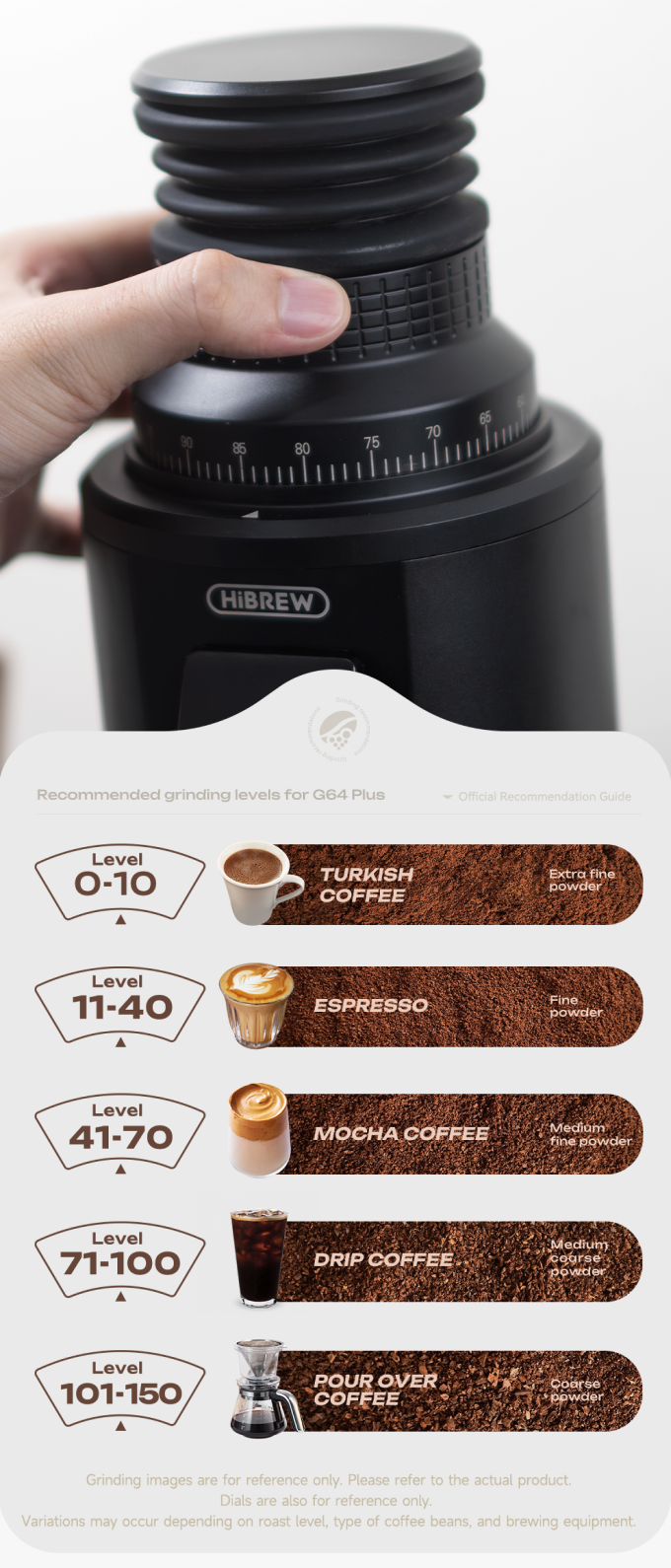 150단계 정밀 조절을 통해 터키쉬 커피(0-10)부터 에스프레소(11-40), 모카(41-70), 드립(71-100), 푸어오버(101-150)까지 전 영역을 지원합니다. 원두 종류와 추출 기구에 맞춰 최적의 입자 크기를 자유롭게 선택하여 전문적인 브루잉이 가능합니다.