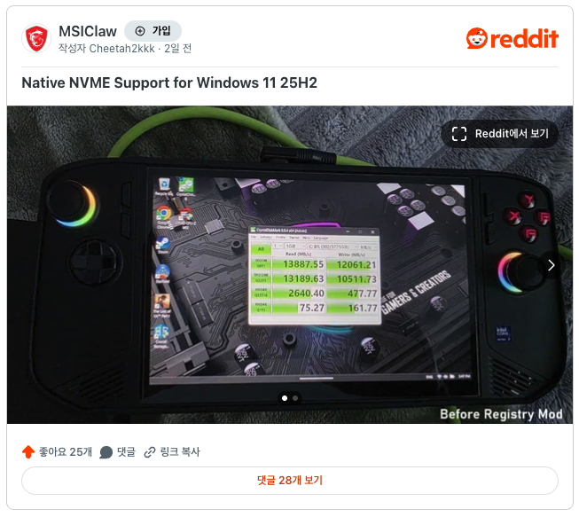 [Reddit] Native NVME Support for Windows 11 25H2 | @cheetah2kkk | https://www.reddit.com/r/MSIClaw/comments/1pslvvv/native_nvme_support_for_windows_11_25h2/?utm_source=embedv2&utm_medium=post_embed&utm_content=post_body&embed_host_url=https://www.club386.com/windows-11-driver-hack-boosts-nvme-ssd-performance-by-up-to-85/