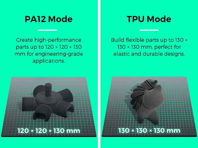 K-100은 엔지니어링급 PA12 모드에서 최대 120 x 120 x 130m의 고성능 부품 제작을 지원하며, 탄성과 내구성이 뛰어난 TPU 모드에서는 최대 130 x 130 x 130mm의 유연한 부품 출력을 구현합니다.