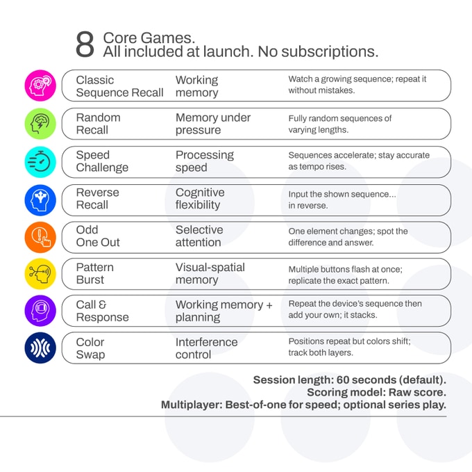 오프라인 플레이를 기본으로 하되 글로벌 랭킹과 고스트 런 등 경쟁 요소를 갖췄으며, 앱 연결 없이도 언제 어디서나 즉각적인 두뇌 트레이닝이 가능한 독립형 콘솔입니다.