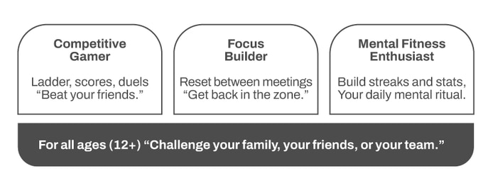 브레인블링크(BrainBlink)는 친구와 승부를 즐기는 경쟁적인 게이머부터 집중력 리셋이 필요한 직장인, 매일의 두뇌 훈련을 즐기는 애호가까지 모두를 위한 기기입니다. 12세 이상 누구나 가족이나 팀원과 함께 즐기며 일상 속 건강한 몰입 습관을 형성할 수 있습니다.