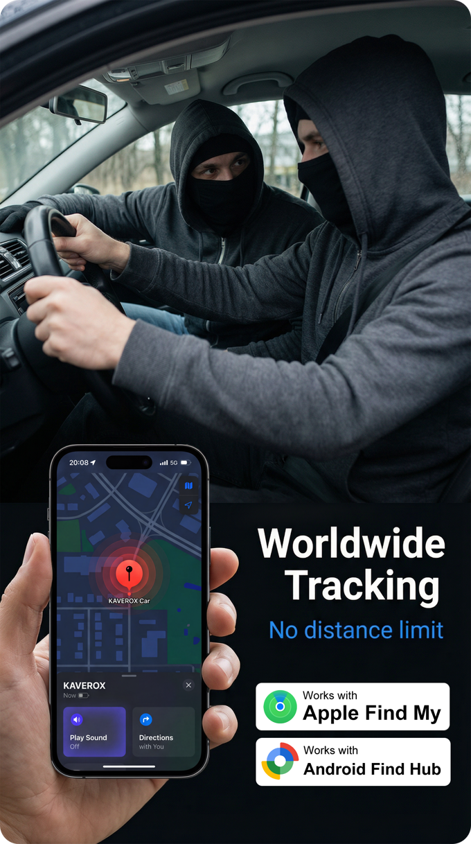 카베록스(Kaverox)는 별도의 구독료나 복잡한 설정 없이 애플과 구글의 글로벌 위치 추적 네트워크에 직접 연결됩니다. 차량 도난 시에도 스마트폰으로 즉시 위치를 확인할 수 있으며, 평범한 충전기 외형 덕분에 외부의 의심을 사지 않습니다.