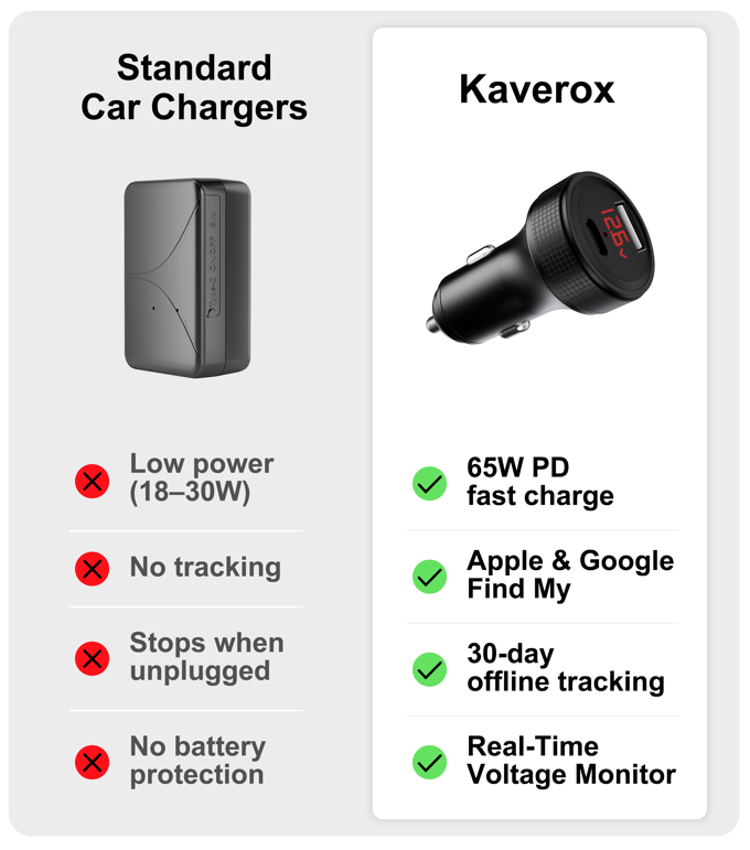카베록스(Kaverox)는 65W GaN 급속 충전과 실시간 전압 모니터링을 지원하며, 애플·구글 듀얼 위치 추적 기술을 결합한 차량용 충전기입니다. 기기가 분리되거나 시동이 꺼져도 내장 된 슈퍼커패시터를 통해 최대 30일간 위치 추적이 가능합니다. 일반 충전기처럼 보이는 견고한 금속 디자인으로 도난 시에도 보안성을 극대화한 혁신적인 차량용 솔루션입니다.