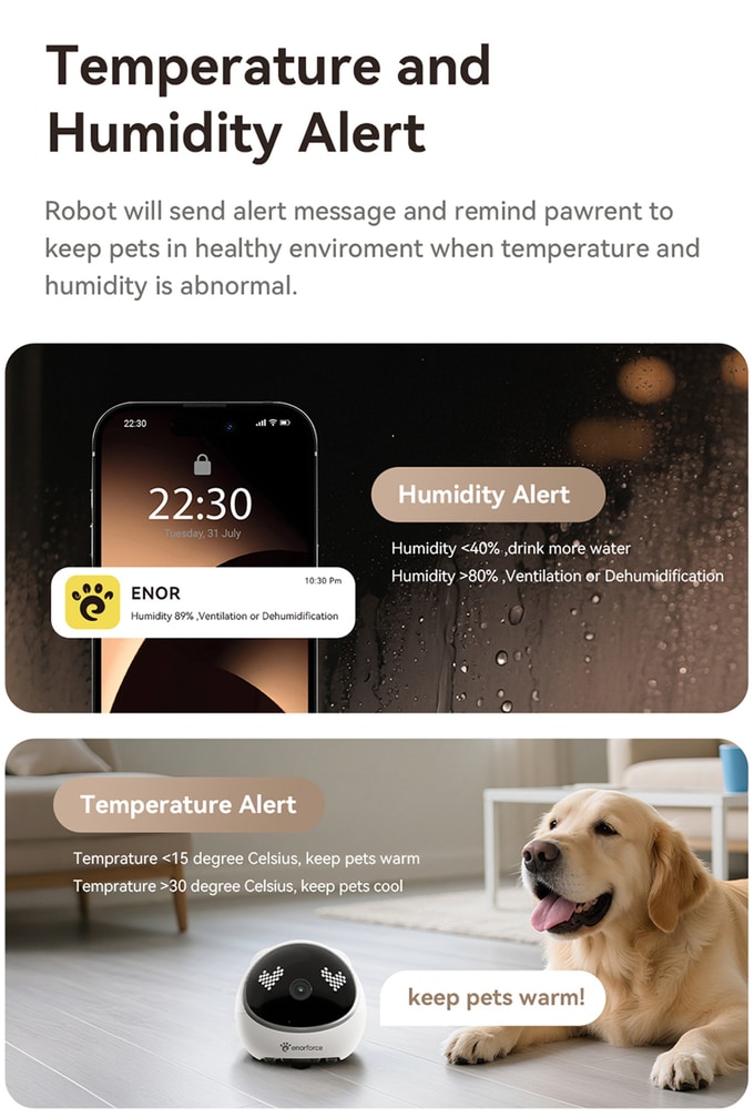 E1은 실내 온습도를 실시간 모니터링하여 적정 범위를 벗어날 경우 즉각 알림을 전송합니다. 이를 통해 보호자는 번거로운 확인 절차 없이도 반려동물에게 최적화된 쾌적하고 안전한 생활 환경을 상시 유지하며 안심할 수 있습니다.