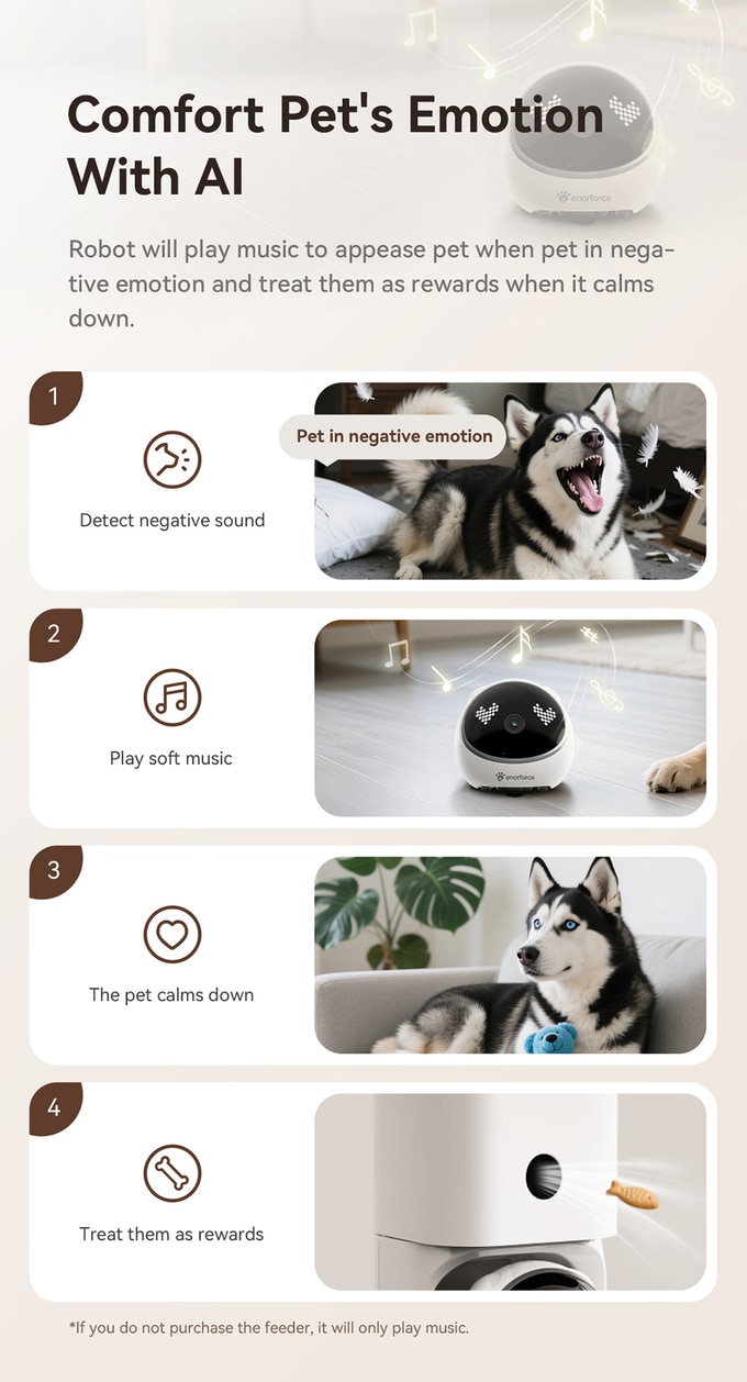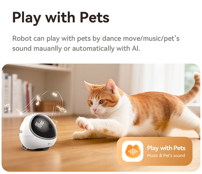 E1 컴패니언 로봇은 춤 동작, 음악, 반려동물의 소리로 수동 또는 AI를 통한 자동 모드로 반려동물과 친구가 되어 놀 수 있습니다.