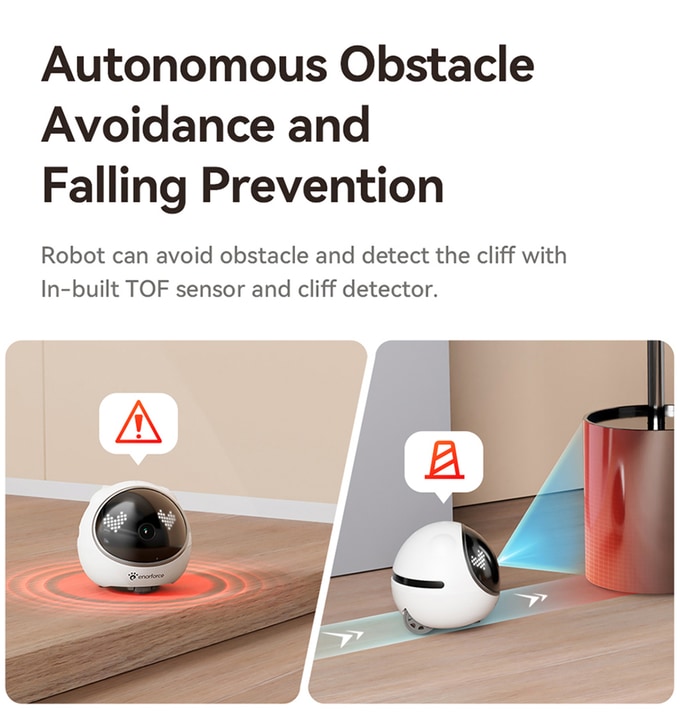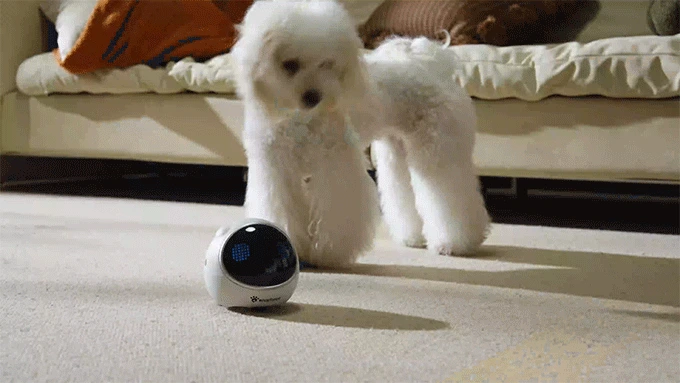 E1은 공간 제한 없이 자유롭게 이동하며, 원격으로 집안을 모니터링을 지원하고 인공지능으로 반려동물을 자동 감지합니다.