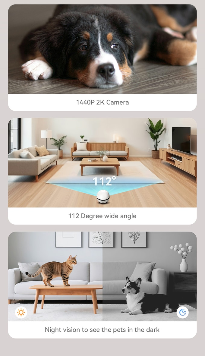 1440p 2K 고해상도 카메라와 112° 광각 렌즈, 나이트 비전 기능을 탑재해 주야간 관계없이 선명한 시야를 확보합니다. 반려동물의 역동적인 낮 활동부터 야간의 휴식 모습까지 단 하나의 순간도 놓치지 않고 생생하게 모니터링할 수 있습니다.