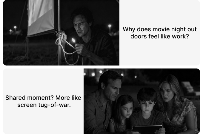 이동성이 강조되는 시대에 살고 있지만, 영상 엔터테인먼트는 여전히 장소의 제약을 받습니다. 태블릿은 개인적인 경험에 그치고, 야외에서 함께 즐기기엔 이동이 불가능한 TV나 빛에 취약하고 별도의 스크린이 필요한 프로젝터의 한계가 일상의 즐거움을 포기하게 만듭니다.