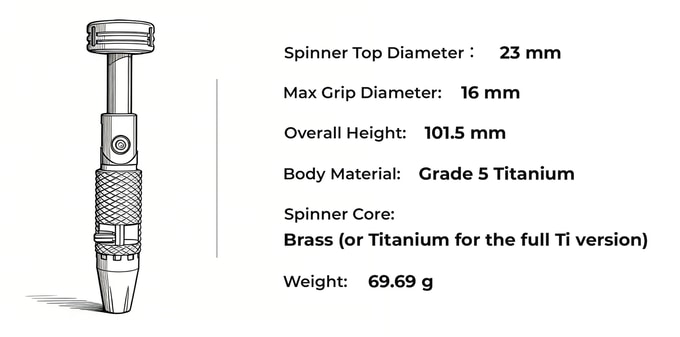 주물이나 프레스 공정의 타협 없이 순수 티타늄과 황동만을 정밀 가공하여 기계적 완성도를 극대화했습니다. 묵직한 라쳇의 클릭감과 완벽한 균형의 스피너, 매끄러운 관절 구동은 손끝에 닿는 순간 압도적인 신뢰감을 줍니다.