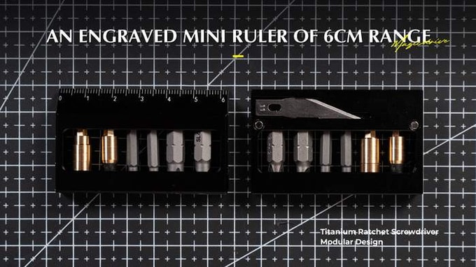알루미늄 비트 홀더 모듈은 CNC 정밀 가공을 통해 6cm 미니 자와 마그네틱 커터, 그리고 규격별 비트 저장 슬롯을 하나로 통합했습니다. 6.35mm와 4mm 비트를 각각 2개씩 수납할 수 있는 효율적인 디자인을 통해, 콤팩트한 본체 안에 멀티툴의 다기능성과 체계적인 수납을 지원합니다.