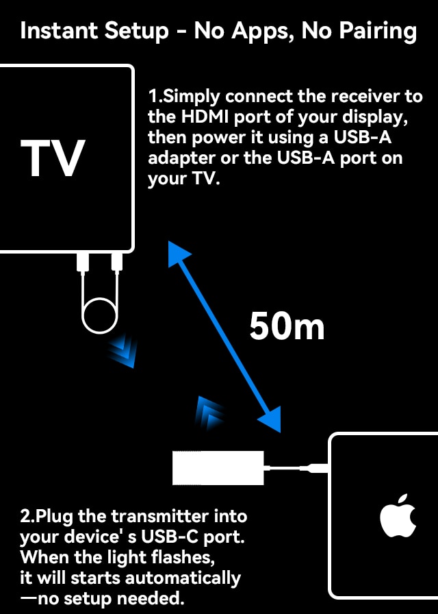무선 C타입 송신기와 HDMI 수신기는 생산 단계에서 이미 사전 페어링되어 출고됩니다. 별도의 설정이나 수동 구성 없이 기기에 꽂는 즉시 연결되므로, 상자에서 꺼내는 순간부터 완벽한 플러그 앤 플레이의 편리함을 누릴 수 있습니다.