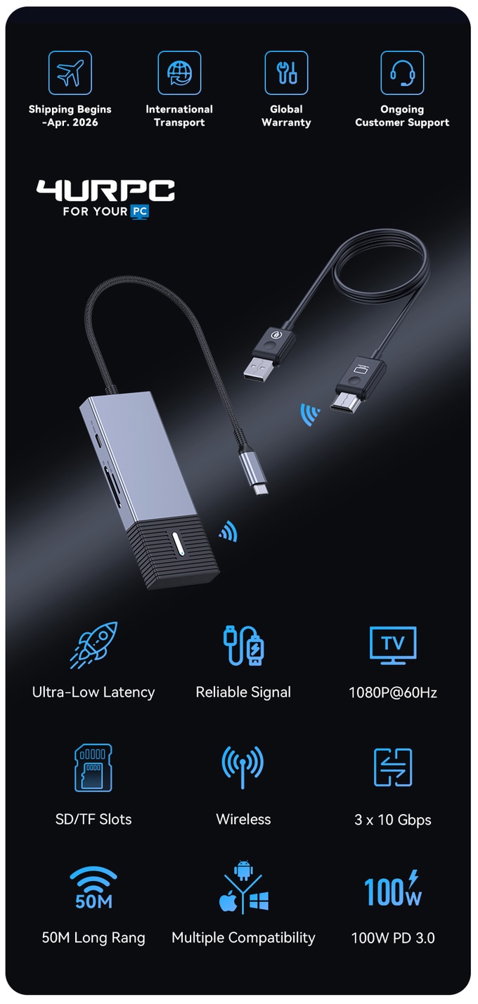 4URPC 3세대는 무선 디스플레이와 다기능 허브를 결합한 혁신적인 올인원 기기입니다. 최대 50m 거리에서 1080p 60Hz의 안정적인 저지연 투사를 지원하며, 100W 전력 공급 및 SD/TF 슬롯, USB 포트 확장까지 단 하나의 장치로 완벽히 해결하는 플러그 앤 플레이 솔루션입니다.