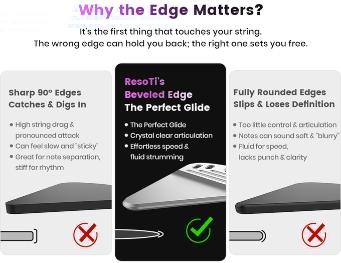 레소티(ResoTi)의 엣지 부분은 단순한 수치를 넘어 현을 놓는 순간의 미세한 감각까지 고려해 설계되었습니다. 중심선을 따라 균일하게 가공된 베벨드 엣지(Beveled Edge) 덕분에 모든 스트로크가 현에 걸리거나 미끄러지지 않고 일관되게 접촉하며, 가장 자연스럽고 예측 가능한 연주가 가능합니다.