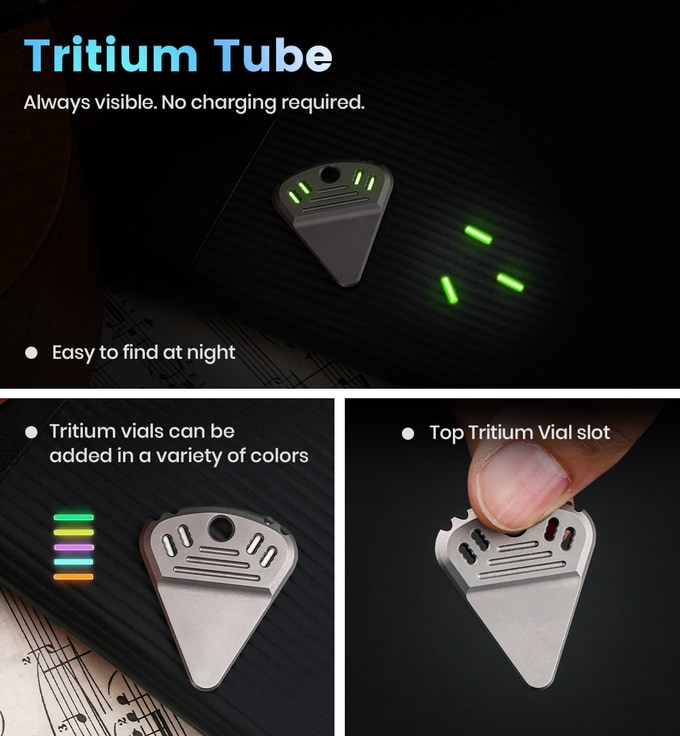 트리튬과 발광 튜브는 추가 옵션입니다. 트리튬은 4개가 한 팩으로 별도의 충전 없이 스스로 상시 발광하며, 발광 튜브는 빛에 노출된 후 빛을 냅니다. 오렌지, 아이스 블루 등 5가지 트리튬 색상은 크라우드 펀딩 종료 후 배송 주소 확인시 선택할 수 있습니다.