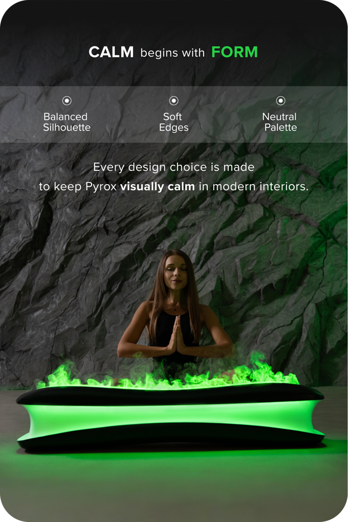 파이록스(Pyrox)는 인테리어불멍, 무드등으로 활용할 수 있습니다. 전원 오프 상태 모두에서도 심미적 가치를 제공하며, 별도 환기 시설 없이도 아파트나 사무실 등 모든 실내 공간에서 평온함을 제공합니다.