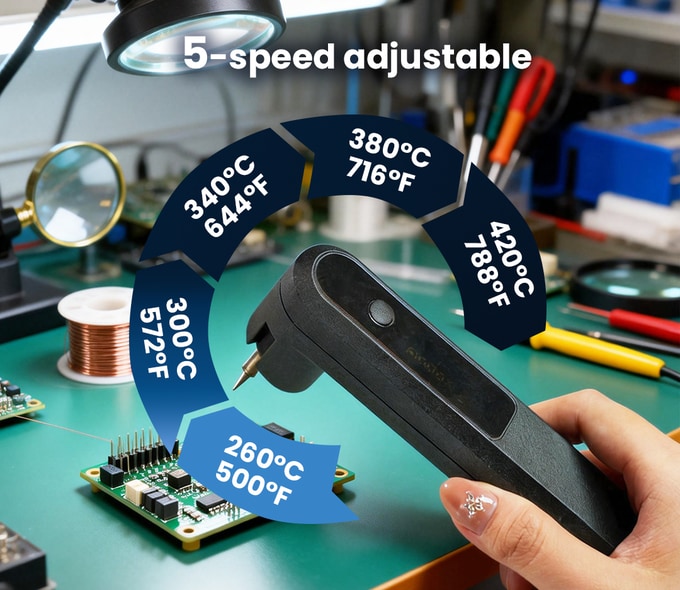첨단 가열 시스템을 통해 D01은 전원 가동 후 단 9초 만에 설정 온도에 도달하므로, 대기 시간 없이 즉각적으로 정교한 납땜 작업을 시작할 수 있습니다.