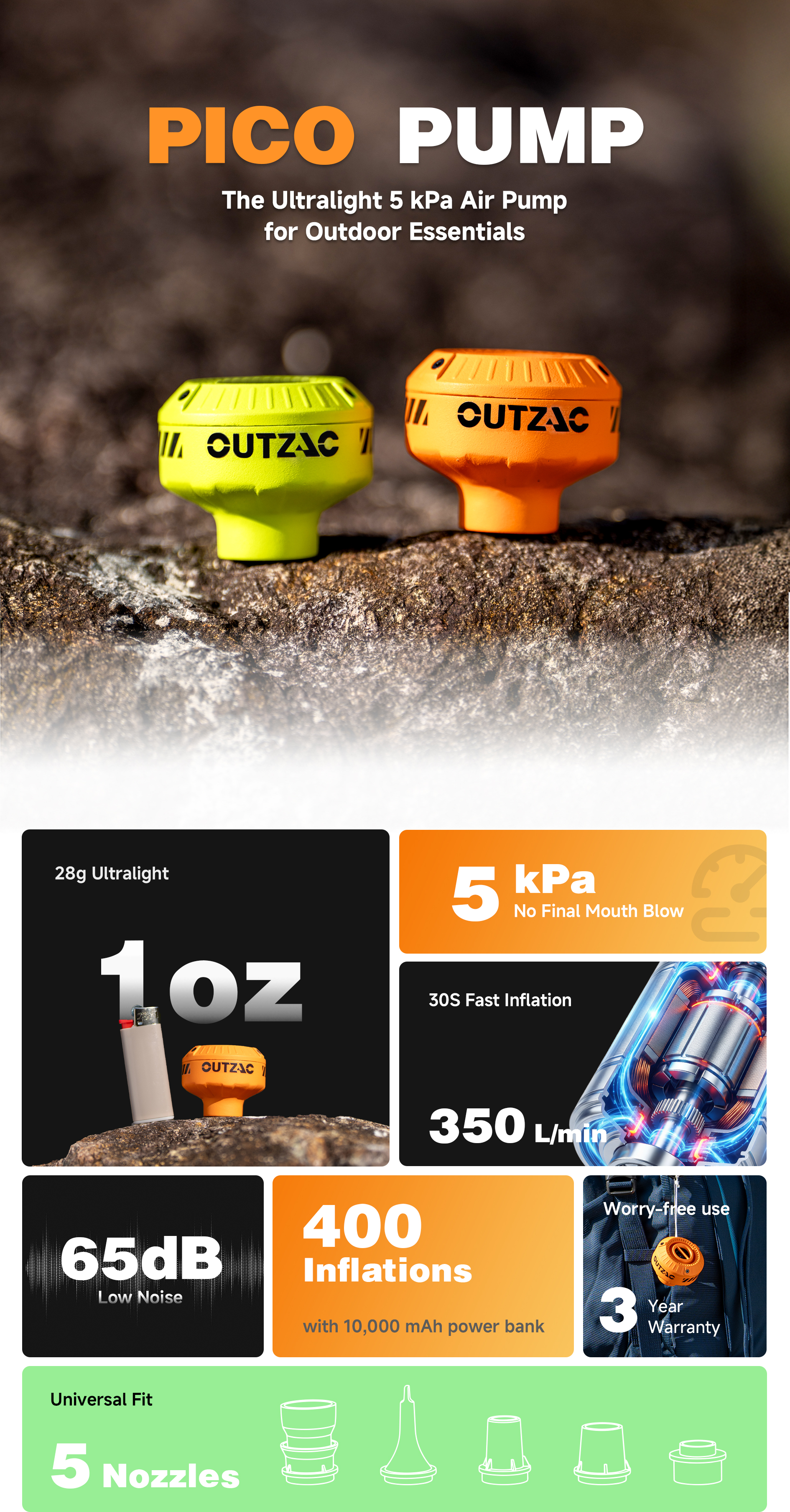 피코펌프(PICO PUMP)의 제조사인 아웃잭(OUTZAC)은 아웃도어를 삶을 위하여 한계를 넘어선 자유를 제공하는 전문 기어 브랜드입니다. 글로벌 디자이너와 엔지니어들이 협업하여 미니멀리즘과 고성능을 동시에 구현하며, 남극부터 사막까지 극한의 환경 테스트를 거쳐 입증된 신뢰성 높은 기기를 제조하는 스타트업 입니다.