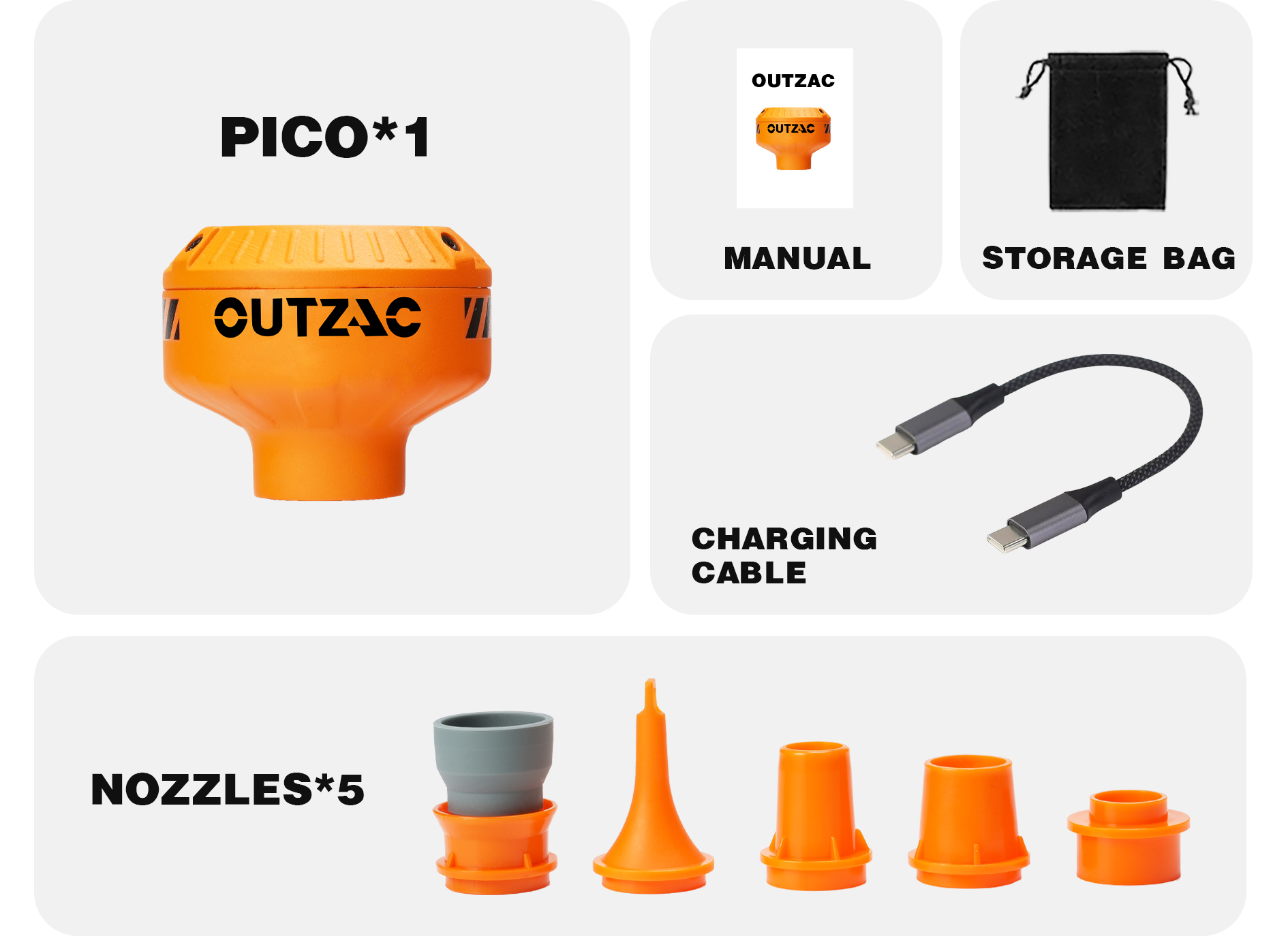 피코펌프(PICO PUMP)는 5종의 교체형 노즐과 내장 노즐을 갖춰 시중 대부분의 매트 브랜드와 완벽히 호환됩니다. 물놀이 튜브부터 대형 에어 매트리스, 진공 압축팩까지 하나의 펌프로 모든 공기 주입 니즈를 해결하는 뛰어난 범용성을 제공합니다.