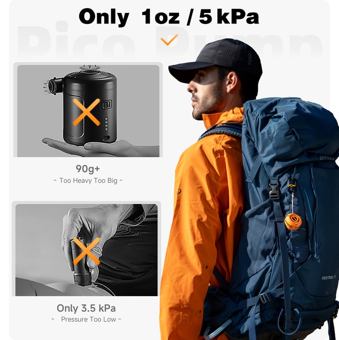 기존 미니 펌프들은 압력이 3.5kPa에 불과해 매트를 팽팽하게 채우지 못하고 결국 입으로 불어야 하는 위생과 번거로움의 문제가 있었습니다. 하지만 28g(1oz)의 초경량 피코펌프는 전문가급인 실질 5kPa 압력을 구현하여, 단 한 번의 작동만으로 습기 유입이나 곰팡이 걱정 없이 매트를 완벽하게 직립시킵니다.