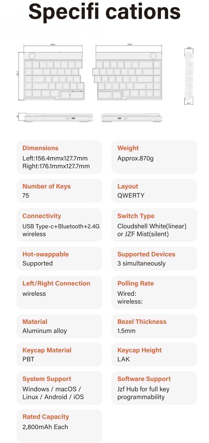 지피75(Jiffy75)는 사용자 신체에 맞춘 설계를 지향하는 75% 배열의 무선 인체공학 분리형 키보드입니다. 항공우주 등급의 CNC 알루미늄 유니바디로 내구성을 갖췄으며, 스플릿 구조를 통해 어깨와 손목에 도움이 됩니다. 전용 소프트웨어인 Jzf Hub로 전 키 매핑과 노브 커스터마이징이 가능하며, 저소음 '미스트(Mist)' 키스위치를 적용하여 건강한 타이핑으로 생산성을 향상합니다.