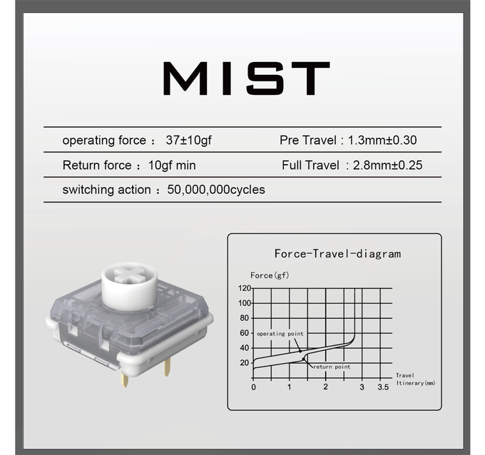 조용한 타건감과 우수한 키감을 동시에 원하는 수요를 반영하여, 37g의 가벼운 키압을 가진 커스텀 저소음 스위치 '미스트(Mist)'를 개발했습니다. 이를 통해 주변에 소음 방해를 주지 않으면서도 최상의 타이핑을 제공합니다.