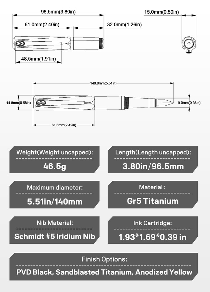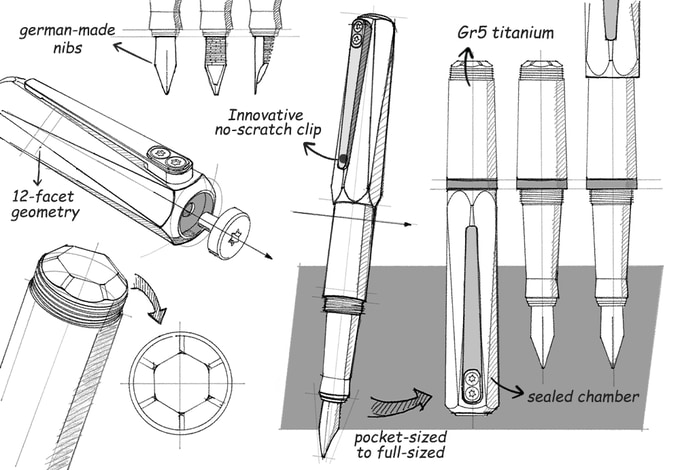 모든 위대한 도구는 스케치에서 시작됩니다. 루민크(Lumink)는 1.6온스(45ml)의 가벼움으로 휴대성을 극대화한 5등급 티타늄 만년필입니다. 평소에는 3.8인치(9.7cm)로 주머니에 쏙 들어가지만, 필기 시 5.5인치(14.0cm)로 확장되어 묵직한 안정감을 제공합니다.