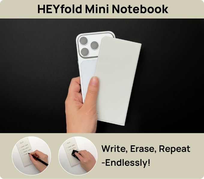 헤이폴드 미니(HEYfold Mini)는 독자적인 Duraflexa™ 실리콘 코어와 Inkvera™ 코팅 기술을 결합하여, 전용 펜으로 번짐 없이 쓰고 흔적 없이 지우는 무한 재사용 가능한 노트 입니다. 스마트폰 크기의 디자인에 펜과 카드 수납이 가능한 마그네틱 설계를 더해, 이동 중에도 간단하게 메모 할 수 있습니다. 스마트폰의 카메라나 디지털 스캔 앱을 사용하여 메모를 저장하고 공유할 수 있습니다.