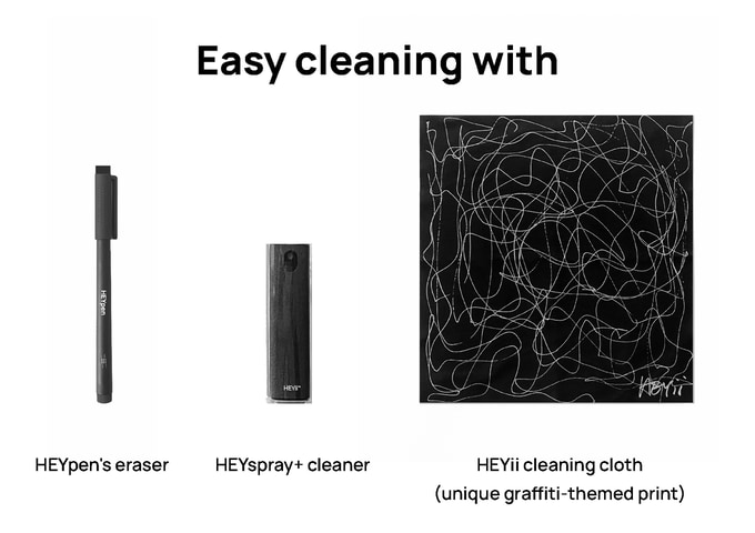 광범위하게 지울 때는 습식으로는 헤이스프레이(HEYspray)를 뿌린 후 헤이이(HEYii) 클리닝 천으로 닦아서 깔끔하게 지울 수 있습니다.