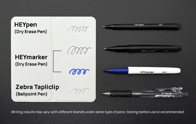 수성 보드마커 및 전용 펜과 호환되도록 설계되어 부드러운 필기감과 깔끔한 지움성을 동시에 제공합니다. 특히 전용 헤이마커(HEYmarker)와 헤이펜(HEYpen) 뿐 아니라 제브라(Zebra)의 타프리클립(Tapliclip) 볼펜에 최적화되어 있어, 찌꺼기 없는 깨끗한 필기 환경과 최상의 사용 경험을 지속적으로 유지할 수 있습니다. 다른 펜도 가능하나 사용전에 반드시 테스트 해보시기를 추천 드립니다.