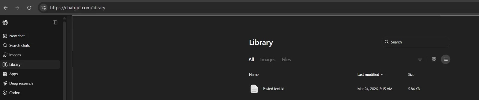 라이브러리(Library)는 ChatGPT 인터페이스 좌측 사이드바에서 확인할 수 있으며, 파일 목록을 한눈에 조회하고 다운로드, 삭제, 필터링(파일 유형 및 생성 방식 기준) 등의 작업을 수행할 수 있습니다.