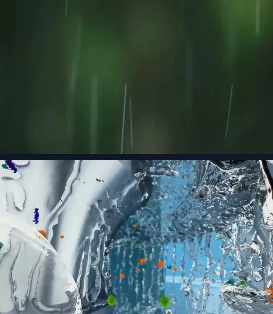 1단계) 내부에서 물을 초고속으로 회전·미세화하여 빈틈없는 '360도 워터 실드'를 형성합니다. 끊임없이 순환하는 액체 필터망이 공기 중의 오염 물질을 전 방위에서 포집하여 완벽한 정화 기반을 마련합니다.