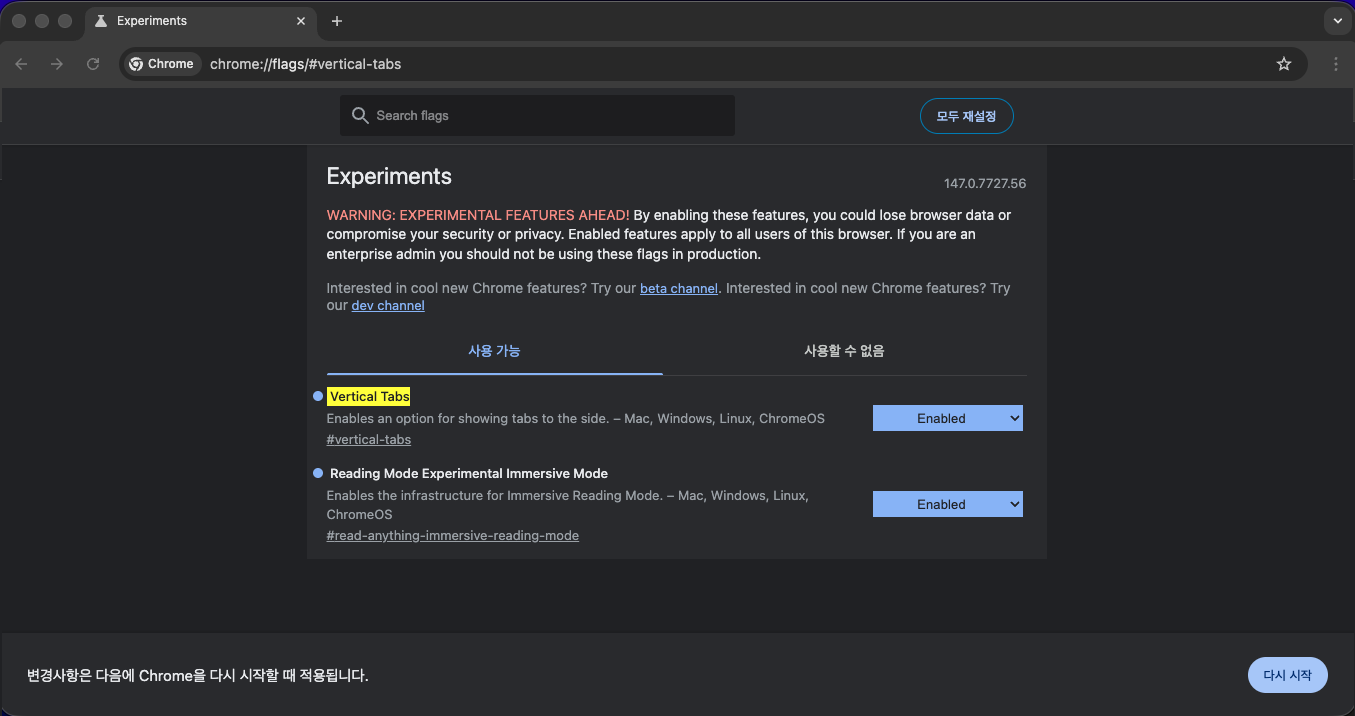 세로 탭 기능이 보이지 않는 경우에는 크롬 주소창에 ‘chrome://flags/#vertical-tabs’를 입력한 뒤 해당 옵션을 활성화해야 하며, 이후 브라우저를 재시작하면 적용됩니다.