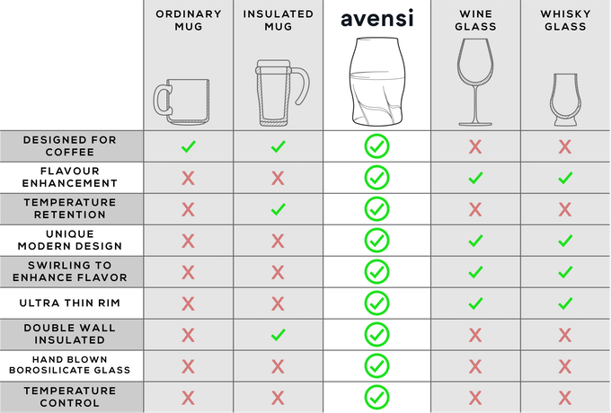 아벤시(AVENSI)는 일반적인 커피를 담는 머그컵이나 텀블러의 장점과 와인잔과 위스키잔의 장점을 모두 합친 잔 입니다.
