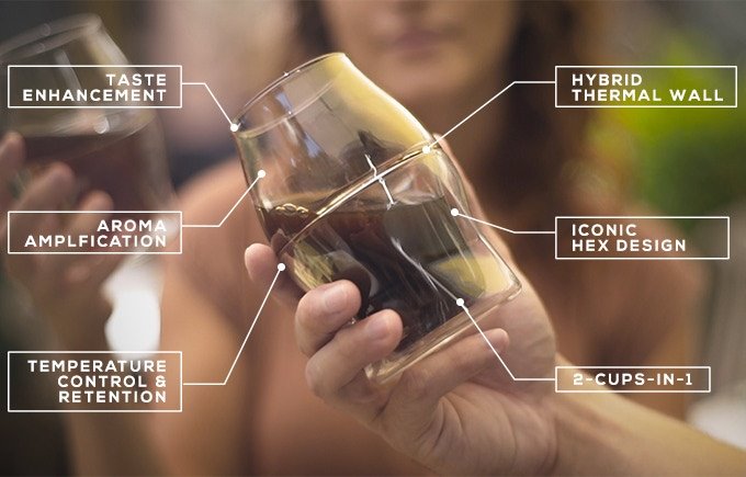 15가지 숨겨진 기능이 포함되어 유리 그 이상의 컵 입니다. 유체역학을 기본으로 하여 디자인 되어 있으며, 커피나 와인이 담긴 잔을 돌리면(Swirling) 갇혀있던 향이 살아납니다. 체온이 전해지지 않도록 이중 유리컵으로 되어 온도 조절도 가능합니다.