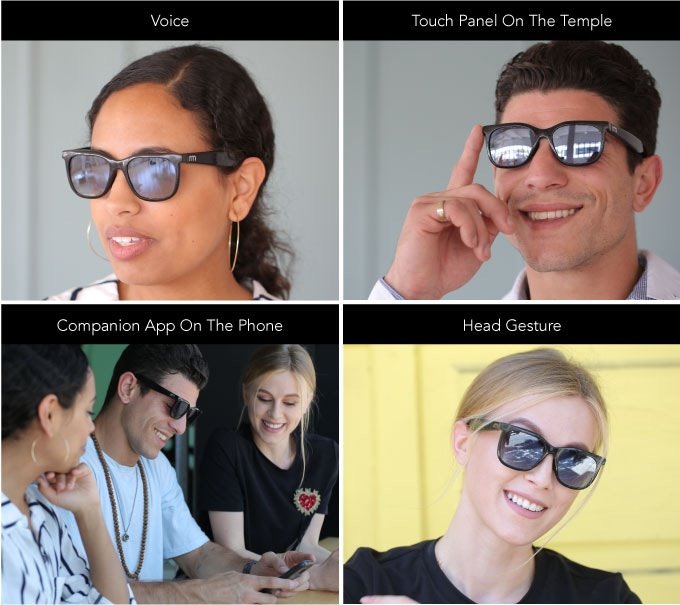 놈글래스 (Norm Glasses)를 동작하는 방법은 음성인식과 안경의 앤드피스와 연결되는 안경다리(Temple) 부분에 터치를 통해 입력할 수 있습니다. 앱으로 제어도 가능하며, 머리를 움직이는 동작인식도 가능합니다.
