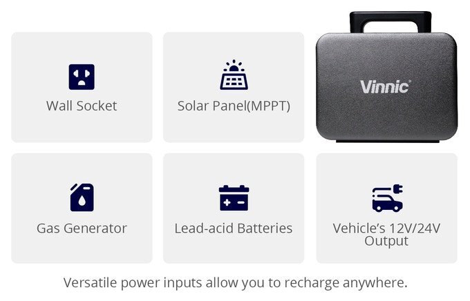 비닉(Vinnic) 파워스테이션은 기본적으로 벽전원과 태양광 패널외에도 전기자동차 충전기를 이용하여 충전할 수 있습니다. 친환경적이지는 않지만 석유를 이용한 발전기나 차량용 납산배터리로도 충전할 수 있습니다.