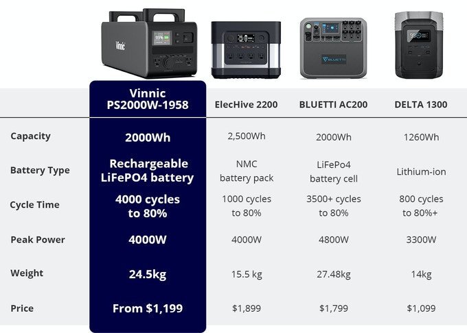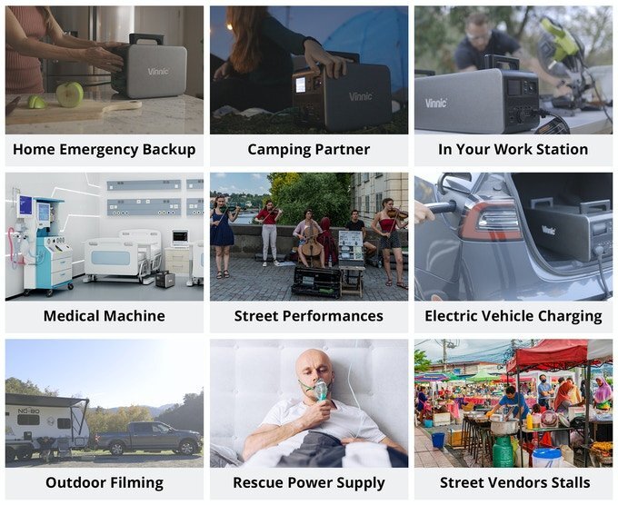 비닉(Vinnic) 파워스테이션은 강력합니다. PS700W 및 PS2000W는 2 x 230V AC 포트, 4 x USB-A 포트, 1 x PD 100W USB-C, 2 x 12V DC 포트, 1 x DC 12V 차량용 담배 포트 및 1 x DC 12.8V를 포함한 다양한 출력 옵션을 제공합니다. PS700W 및 PS2000W 파워스테이션은 가정, 파티, 캠핑 중 또는 비상 전원 백업으로 이상적이며, 냉장고와 같은 가전제품은 물론 전동공구, 의료기기 등 많은 가전제품에 전원을 공급할 수 있습니다.
