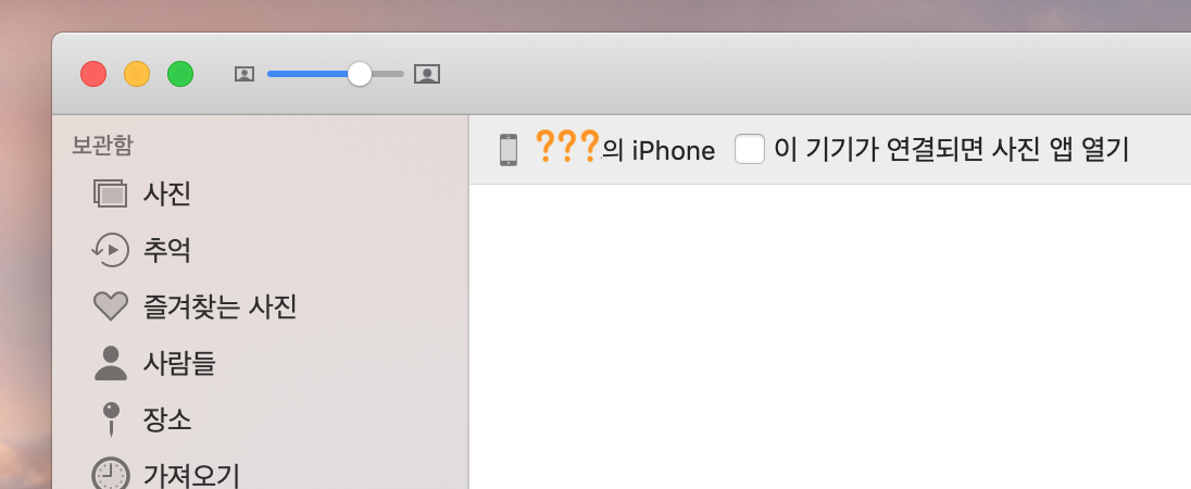 사용하던 아이폰을 잠시 교체하는 과정에서 뭔가 설정이 엉킨 듯 합니다. 자꾸 저에게는 이런 화면이 뜨기 시작했습니다. 처음에는 x 표를 눌러서 간단하게 껐습니다. 뭔가를 연결하면 자꾸 떴습니다. 맥에서 아이폰을 충전할 때였는지는 며칠 지나서 인지하였습니다. 이렇게 늦게 찾았던 이유는 습관에 있었습니다. 맥을 켜자마자 아이폰 충전 케이블을 연결하는 습관 때문에 맥 컴퓨터를 시작하면 사진앱이 뜨는구나 착각한 것입니다.
