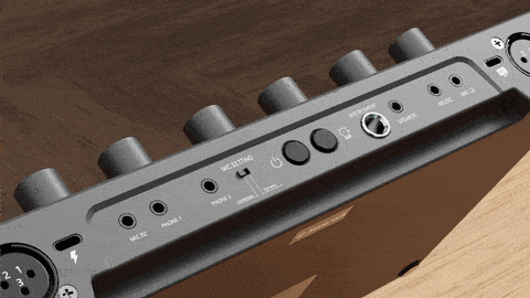 패널 하단 중앙에는 3개의 슬라이더 노브가 있습니다. 왼쪽 슬라이더는 MIC L 그룹(MIC L1, MIC L2)의 볼륨을 조정합니다. 음소거 버튼은 두 개의 마이크를 음소거하는 데 사용됩니다. 오른쪽 슬라이더와 오른쪽 음소거 버튼은 MIC R 그룹(MIC R1, MIC R2)에 대해 동일하게 작동합니다. 가운데 슬라이더는 악기의 볼륨을 조절하기 위한 것입니다.