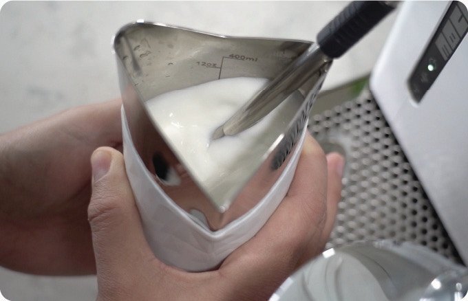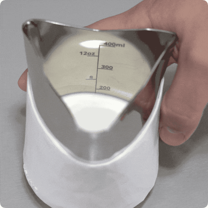 내부 3면 모두에 용량 표시가 있어 우유의 정확한 계측이 가능합니다. 크루브 크리에이트(KRUVE CREATE)는 거품내기전 우유 량으로 100~300ml 정도가 가능하며, 150~250ml의 우유에 최적화 되어 있습니다.