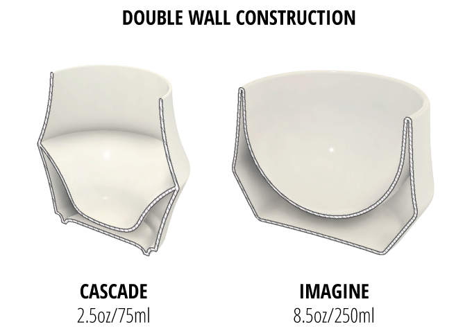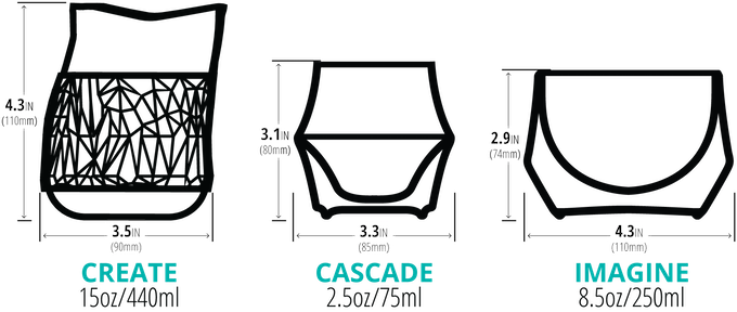 크루브 크리에이트(KRUVE CREATE)와 도자기로 된 라떼컵 이매진(IMAGINE) 및 에스프레소컵 캐스케이드(CASCADE)의 사이즈는 다음과 같습니다.