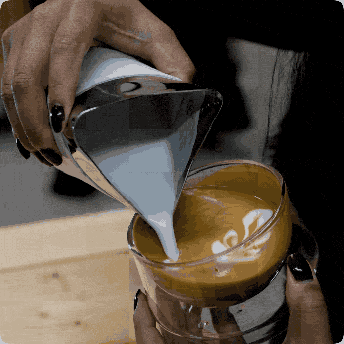 붓는 동안 주둥이(Spout)를 전환하면 완전히 새로운 아트가 만들어집니다. 넓은 주둥이는 하트나 로제타 같은 베이스를 만들고, 클래식이나 좁은 주둥이로 미세한 디테일을 추가할 수 있습니다.